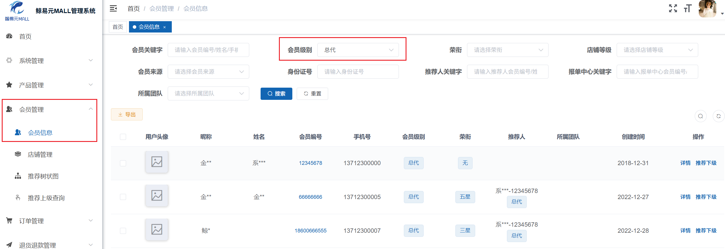 1.“鲸易元MALL管理系统”管理后台中,会员级别为“总代”的数量为?