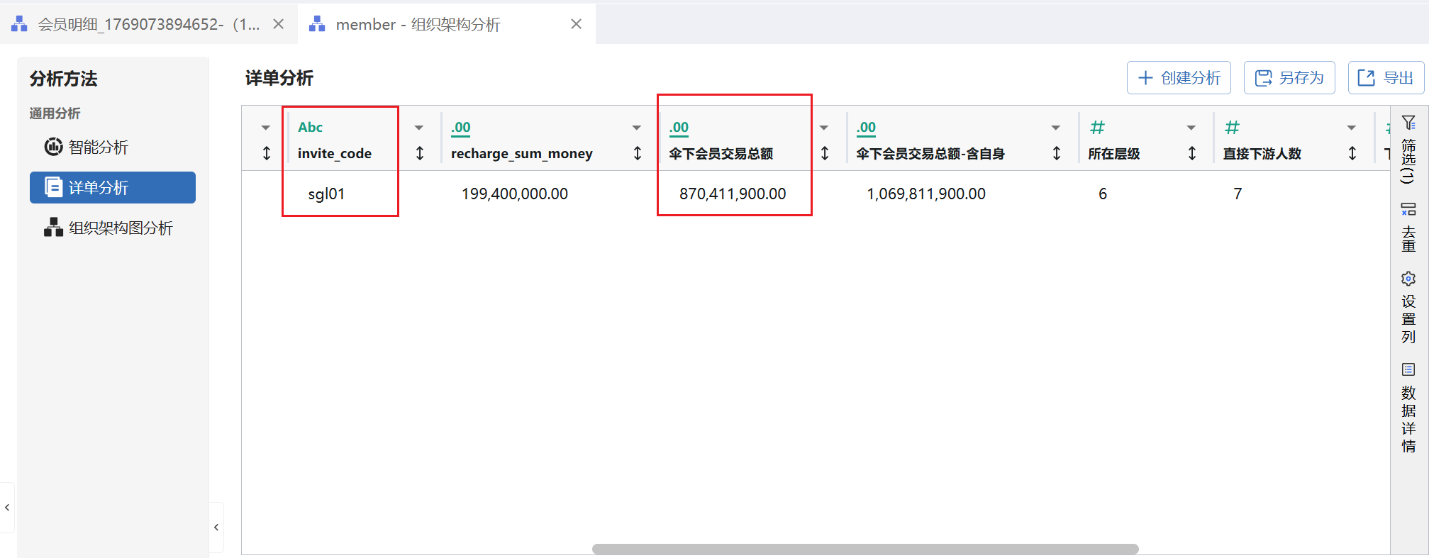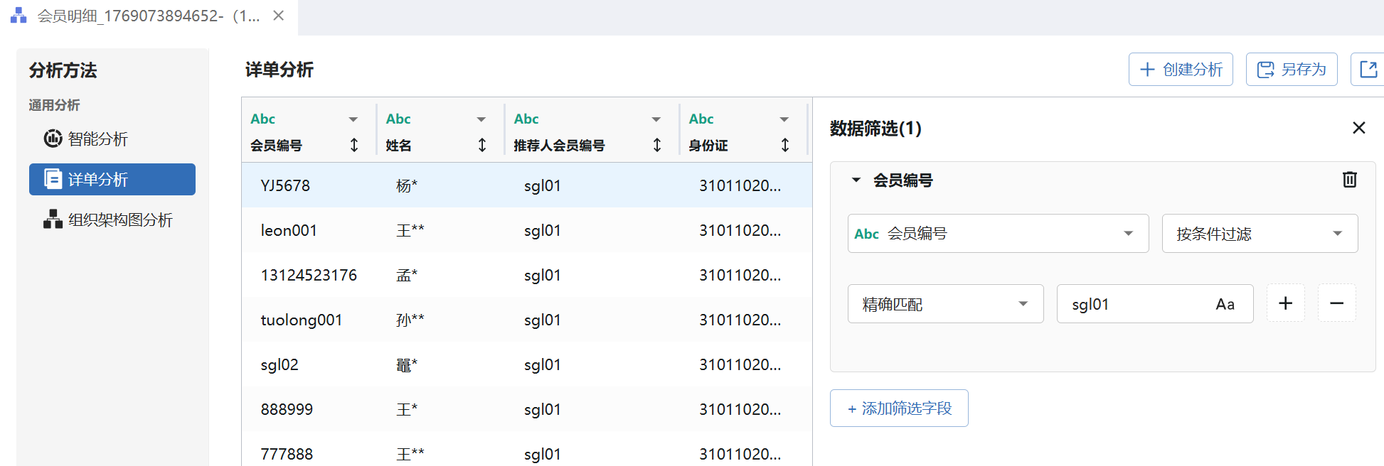 筛选会员编号为sgl01即可