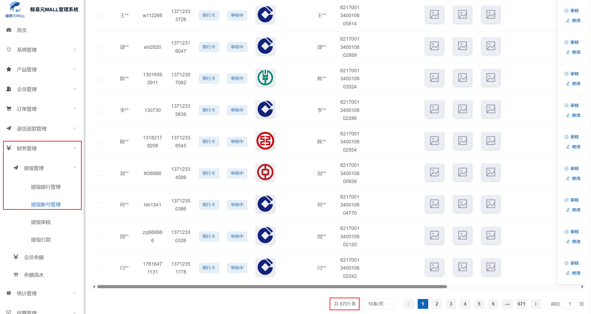 7.“鲸易元MALL管理系统”管理后台中,在提现账号管理页面中银行卡的记录数为?