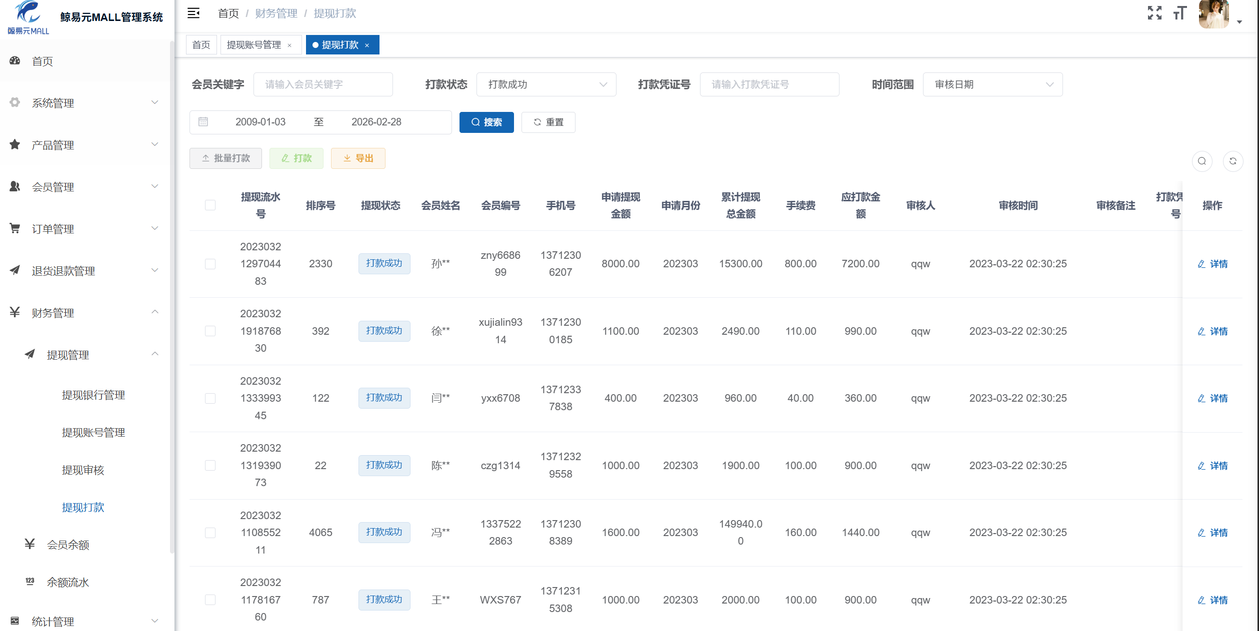 8.“鲸易元MALL管理系统”管理后台中,打款成功的提现记录数量为?
