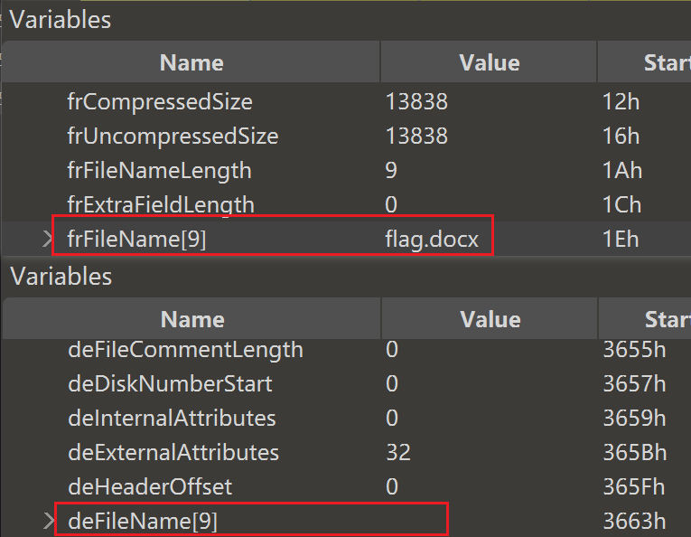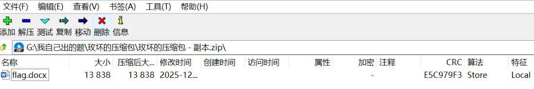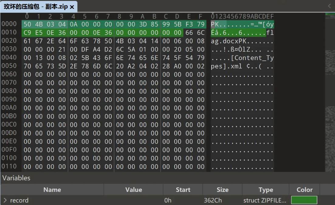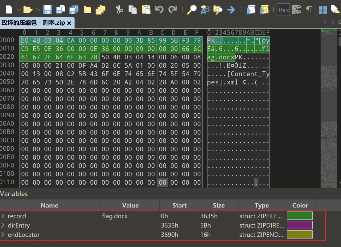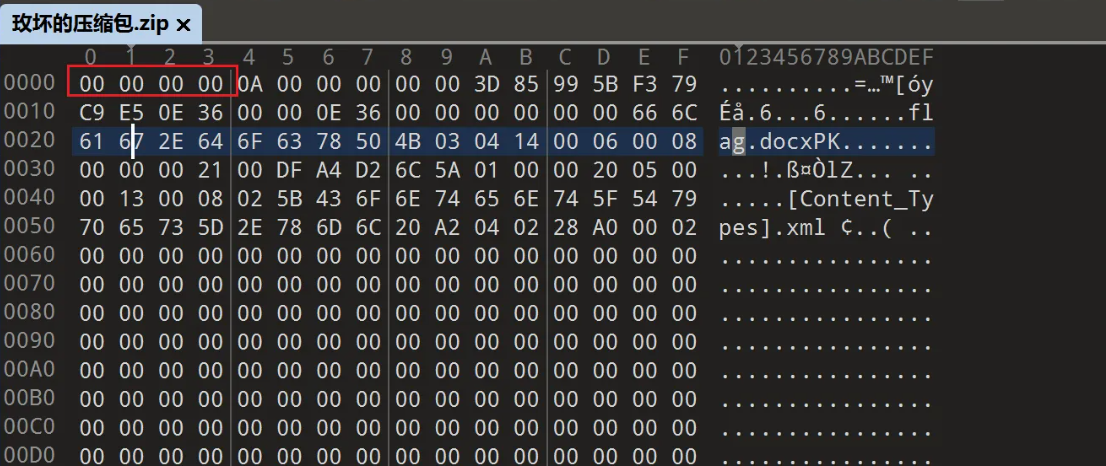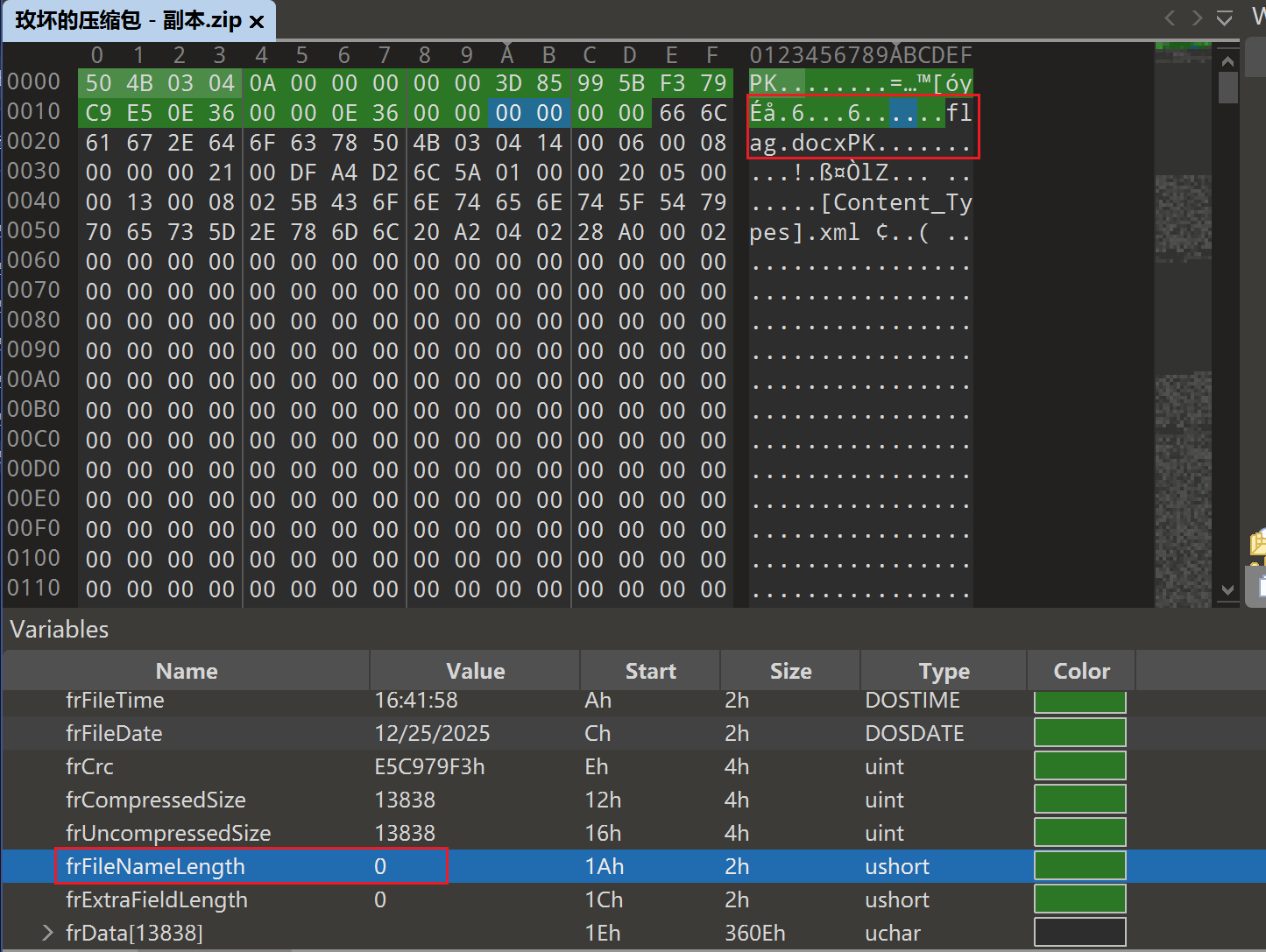 发现明显只有一个文件flag.docx,这边却说长度为0,明显是坏了,于是我们可以修好第二处,改为9