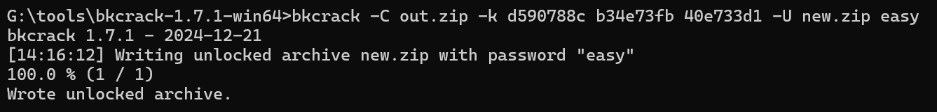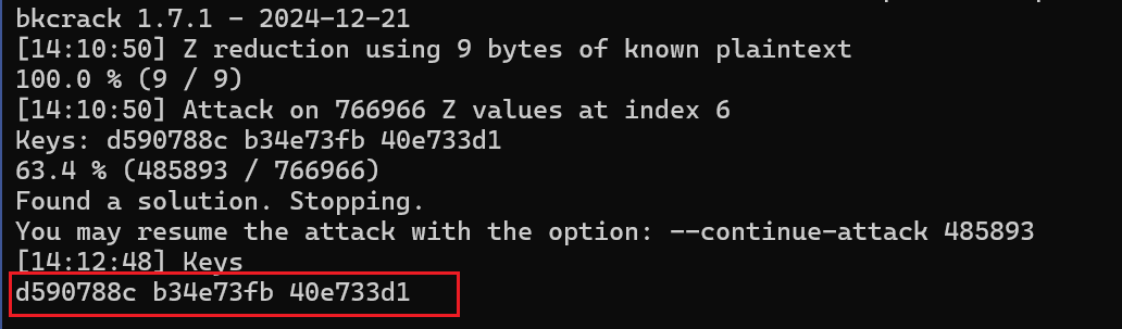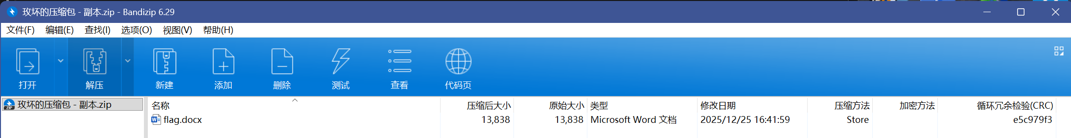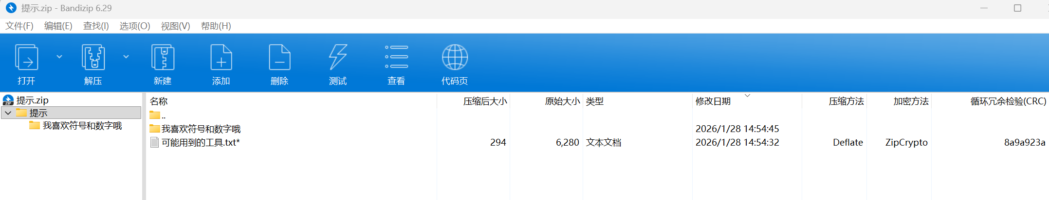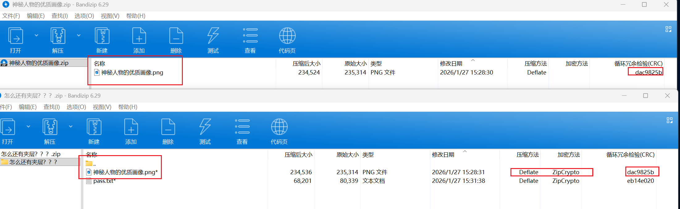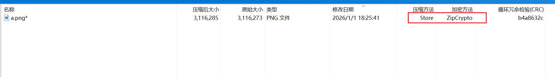这边可以看到很标准的Deflate压缩方式,还是ZipCrypto加密方式,最后CRC还一样,明显就是明文爆破
