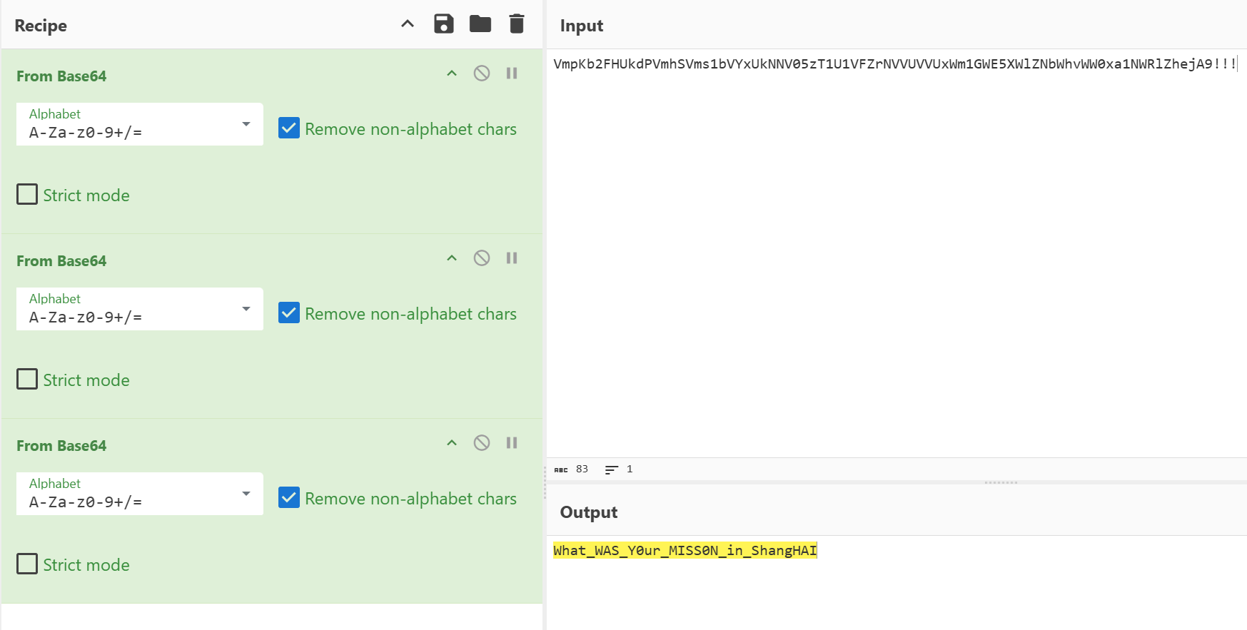 得到真正的flag:flag{What_WAS_Y0ur_MISS0N_in_ShangHAI!!!}(注意这边的!!!,不在base64内)