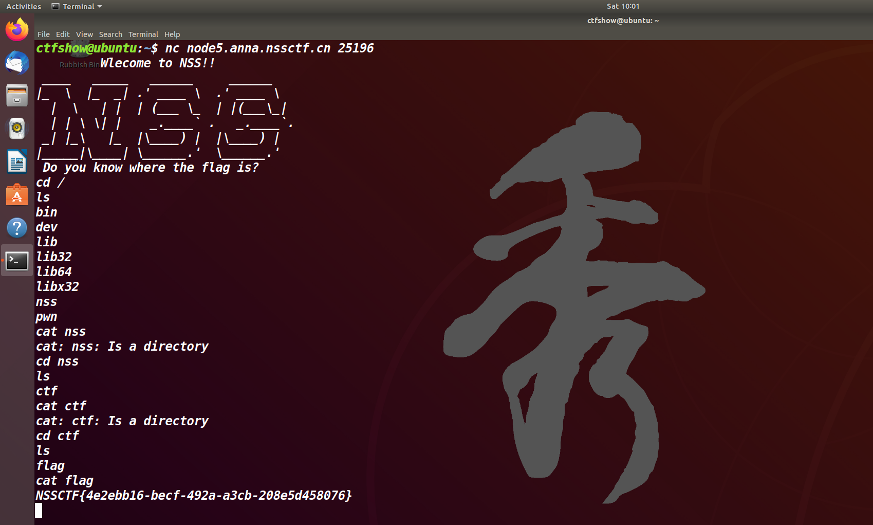 这边我们先进入根目录,ls列一下,发现有个nss,那我想cat一下,结果不是