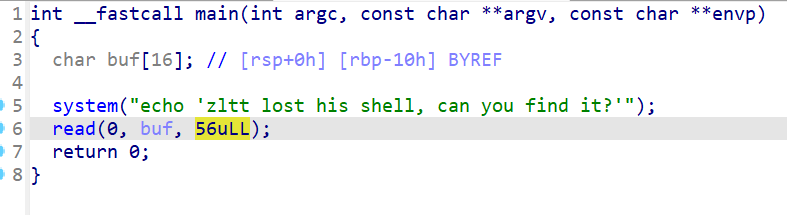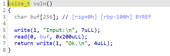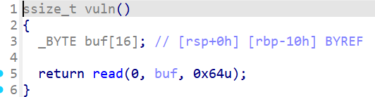 可以看到这边vuln存在有栈溢出的漏洞,因为显然buf只能存储16字节的数据,但是read函数允许读取100个字节以内的数据,因此很容易栈溢出。我们可以通过溢出的部分来执行任意代码