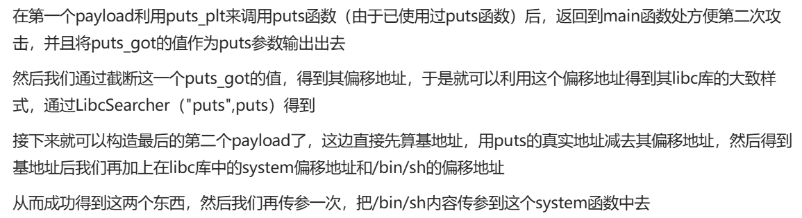 之后就是要泄露libc_base地址了,我们直接利用puts函数传参,在第二次payload直接输出puts的真实地址即可